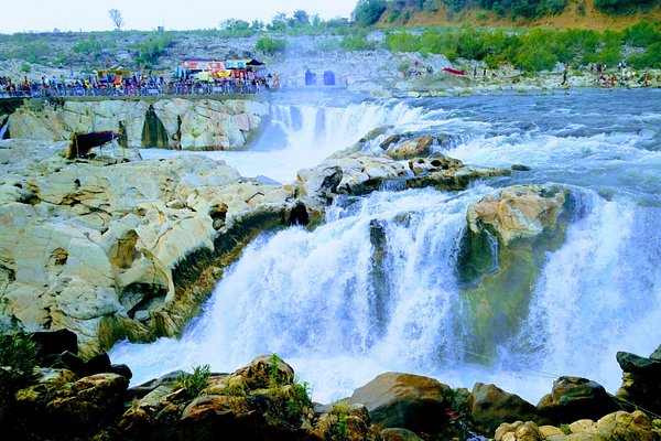 The Marble Rocks at Bhedaghat present a stunning geological formation where the Narmada River flows through a narrow gorge of gleaming white, grey, and brown marble. These towering cliffs, reaching up to 100 feet, offer a mesmerizing boat ride experience, especially under moonlight or during daytime when the sun’s rays reflect on the smooth marble surfaces. The area is renowned for its tranquil beauty and the unique acoustic properties within the gorge. [Wikipedia Link: https://en.wikipedia.org/wiki/Bhedaghat] - Dhuandhar Falls, Bhedaghat