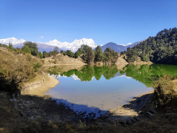 A pristine high-altitude lake famous for crystal-clear reflections of Chaukhamba peak and tranquil natural surroundings.