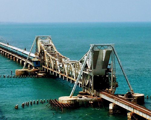 India’s first sea bridge connecting mainland Tamil Nadu with Rameswaram Island, offering scenic views of the ocean and railway structure.
